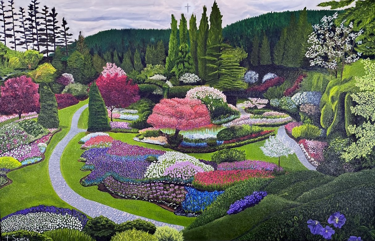 "The Garden of Butchart" transports the viewer into the magical splendor of Canada's national historic site, The Butchart Gardens in British Columbia. In the foreground, vibrant flowers and meticulously manicured ornamental shrubs burst with breathtaking color and intricate detail, inviting a sense of intimate discovery along the winding, enchanted paths where visitors stroll in quiet wonder. As a masterful study of distance, the composition draws the eye upward across a gently rising hillside to the majestic treeline in the far background, where towering trees frame the scene in soft, atmospheric hues, creating layers of depth and a profound feeling of immersion in nature's grandeur.
