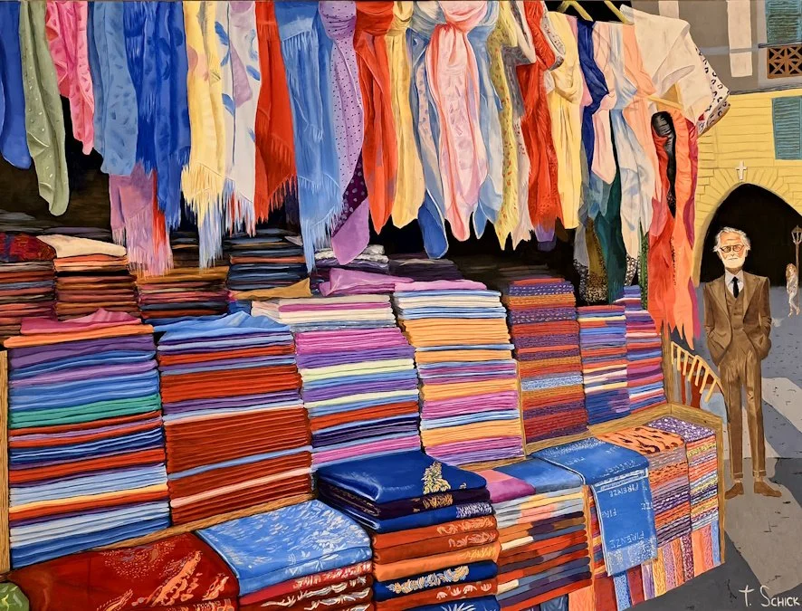 "Silk" vividly captures the essence of a silk scarf vendor amid the bustling streets of Florence, Italy. The composition centers on the vendor's enticing display, where an array of scarves in a dazzling spectrum of colors—rich reds, deep blues, sunny yellows, and soft pastels—cascade and drape in luxurious folds, their lightweight materials flowing with an almost ethereal grace that suggests a gentle breeze.